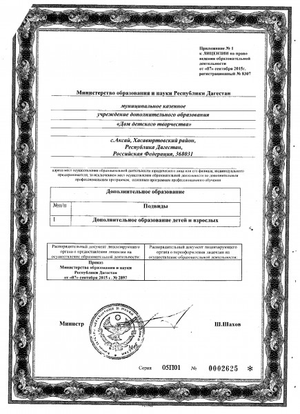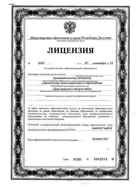 Лицензия МБУ ДО Дом детского творчества Документ подписан электронной подписью Серийный номер 603332450510203670830559428146817986133868575787 Директор/Заведующий Ибрагимова Бурлият Хубайдулаевна Дата подписания документа 31.03.2021 12:14:27 (скачать) (посмотреть)